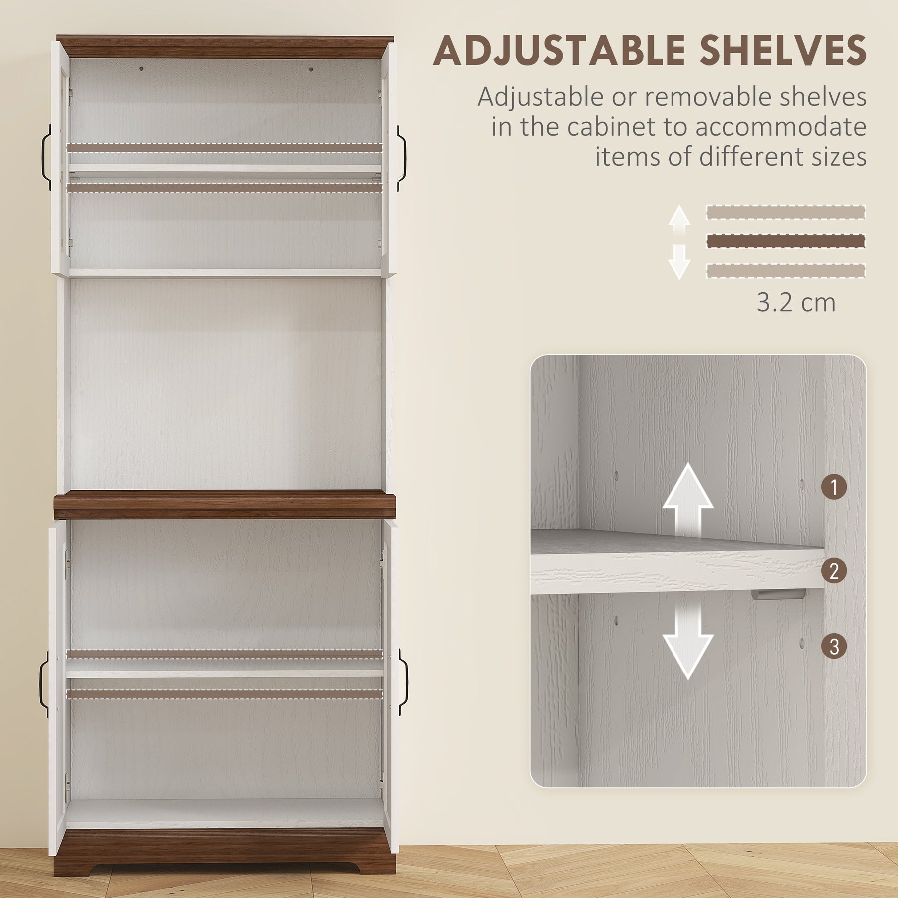 Do you love your kitchen but are running out of space? A HOMCOM kitchen storage cabinet can help bring your kitchen from undersized to organized in no time. This pantry storage cabinet is designed for creating a home coffee bar. It includes an open counter for your coffee machine and an extra shelf for displaying all your favorite mugs. Keep your coffee time from getting cluttered with HOMCOM. Features: - Painted finish with recessed door panels, glass doors, and antique metal hardware - Three shelves with five tiers give you lots of space to store dishes, pots, pans, and dry goods - Open counter with an extra shelf for holding your coffee maker, coffee filters, and mugs - Drawer slides smoothly on its metal rail - Three-level adjustable shelves in the bottom cabinet allow you to store larger items without worrying if they’ll fit - Adjustable stainless-steel hinges to make two doors align to each other - Anti-tipping strap on the back you can secure to the wall for safety - Assembly required Specification: - Color: White - Material: MDF, Tempered Glass - Overall Size: 23.5" W x 15" D x 63.5" H - Top Cabinet Size (Inner): 22.25" W x 7.75" D x 9.75" H - Drawer Size (Inner): 20.5" W x 13.25" D x 4" H - Weight Capacity: 55 lbs. (Overall), 22 lbs. (Counter),5.5 lbs. (Shelf/Drawer) - Item Label: 835-736V00WT Package Includes: - 1 x Kitchen Pantry - 1 x Manual Organize your kitchenware and add more storage space with this HOMCOM hutch cabinet with storage. The upper clear glass-door cabinet allows you easily store plates or display your kitchenware collections. The lower cabinet is excellent for oversized items such as coffee makers, toasters, and dishware, while the shelves are adjustable to fit your storage needs. The wood countertop offers you a spacious area to place your appliances such as your microwave oven, coffee machine, and the like. Features: - Farmhouse design with transparent glass-paneled doors and barn doors - Great for your kitchen, dining room, living room, and hallway - Ample storage with two double-door cabinets and a spacious open area - Adjustable shelves and quality hinges for each door - Solid frame construction and easy-to-maintain wood countertop - Anti-toppling device adds extra stability - Assembly required Specification: - Color: White, Brown - Material: MDF - Overall Dimensions: 28.3" W x 15.7" D x 70.1" H - Upper Cabinet Size: 27.4" W x 9.6" D x 10.4" /8.5" H - Lower Cabinet Size: 27.4" W x 13.6" D x 14.1" /13" H - Countertop Size: 28.4" W x 14.7" D x 17.4" H - Countertop to Floor: 31.9" - Weight Capacity: 110 lbs. (total), 44 lbs. (countertop), 11 lbs. (shelf) - Item Label: 835-394V81WT Package Includes: - 1 x Pantry Cabinet - 1 x Manual.